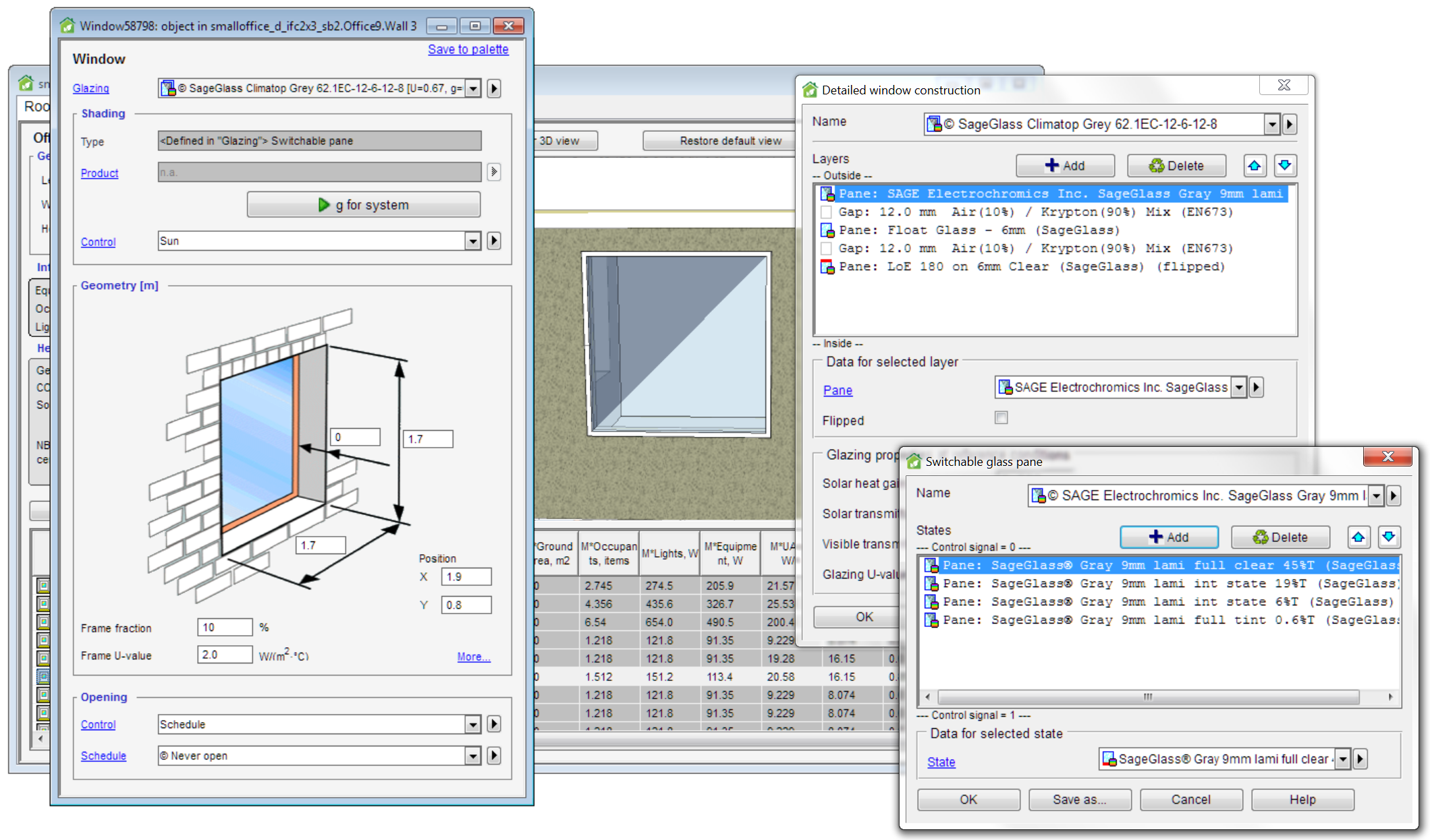 Elektrokromi lasitukset voidaan mallintaa. Valmistajien tuotedataa voidaan käyttää.